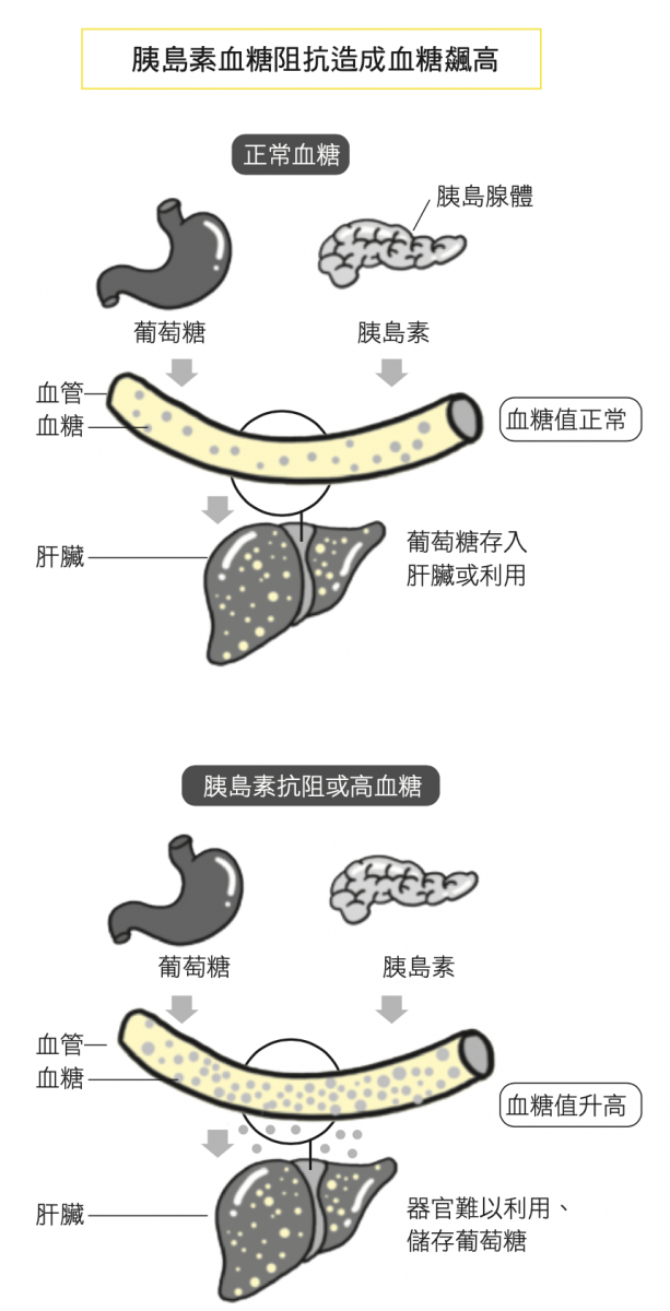 人體細胞無法直接利用食物,一般進入體內的食物,都要先轉變成葡萄糖才能讓身體運用,並且葡萄糖必須跟胰島素結合,始能進入細胞,轉換成細胞代謝所需的能量。假如血液中的葡萄糖與胰島素結合後要進入細胞時,胰島素會發生細胞阻抗的情形,導致血液中的葡萄糖大量堆積在血管中,無法進入細胞;而當葡萄糖無法送入大腦細胞時,大腦就會因為缺乏燃料導致情緒失控、 易怒的現象。血糖吸收異常下,身體將分泌更多的胰島素,好設法使葡萄糖進入細胞,然而血管中的胰島素一旦過多,便會造成血管發炎並且加速細胞老化,而無法進入細胞的葡萄糖, 又會分別堆積在肝臟和血管中,導致脂肪肝和血管發炎,長期下來就會產生各種代謝疾病和器官病變。