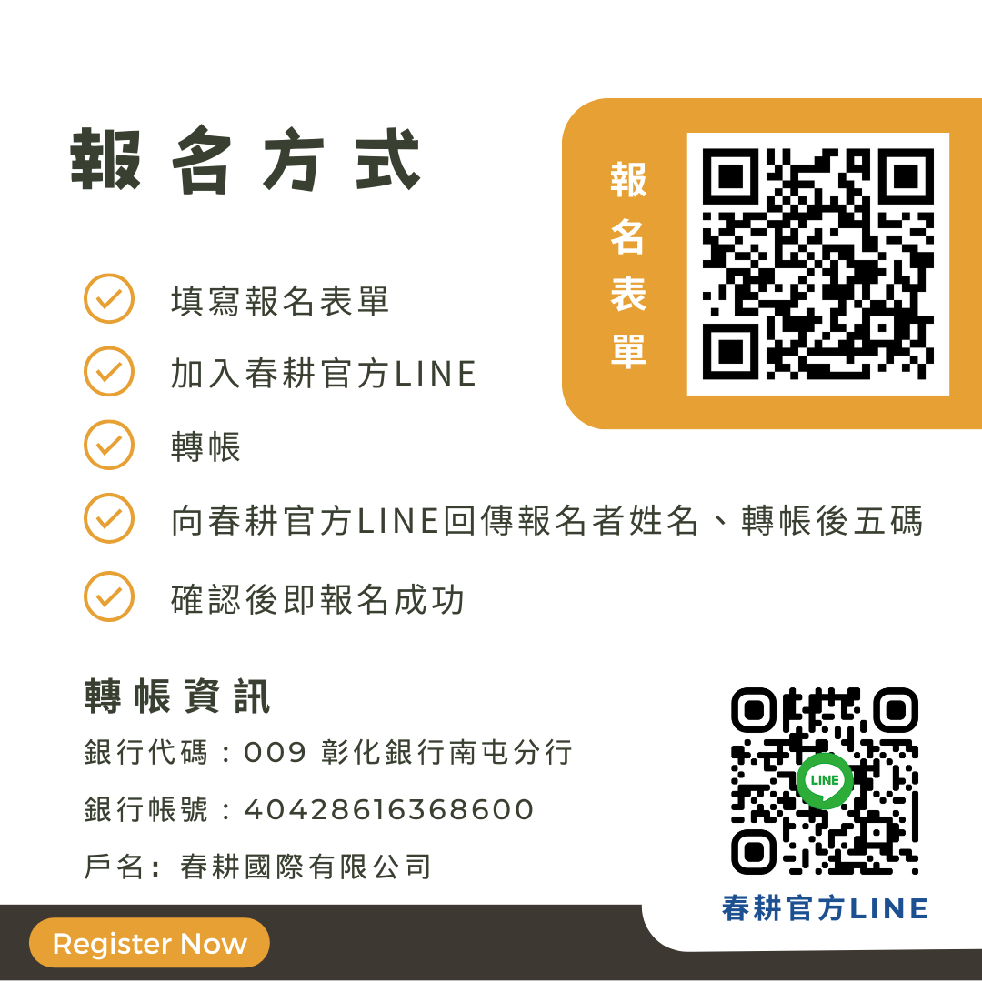 - 向春耕官方LINE 回傳報名姓名及轉帳帳號後五碼