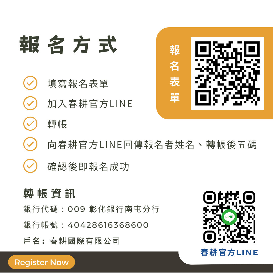 - 向春耕官方LINE 回傳報名姓名及轉帳帳號後五碼