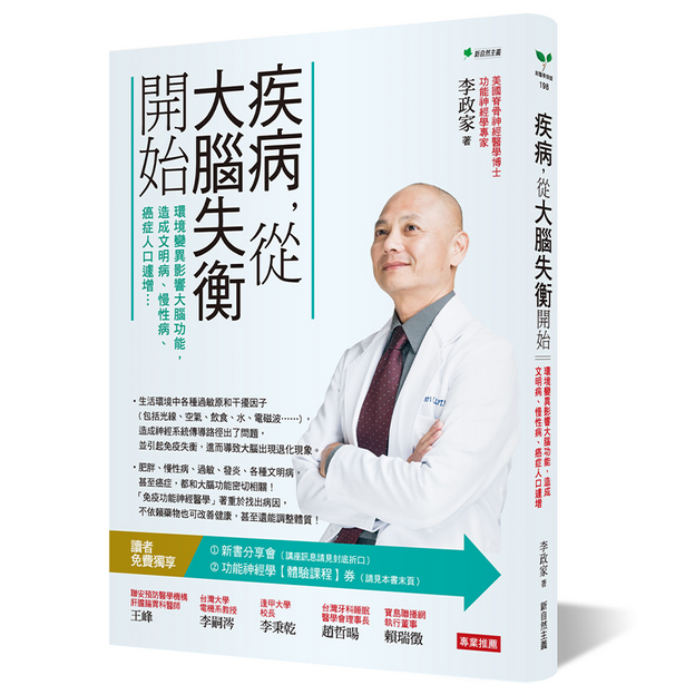 本書中,李博士會一一做介紹,從免疫預防醫學的觀點,探討環境因素誘發慢性疾病和癌症的機制,帶您由功能神經學觀點來探索慢性疾病造成的各種大腦神經退化的臨床症狀與有效處理的對策,並更進一步的從物理能量的角度,討論未來醫學中有關細胞的粒腺體、水、頻率、光和電子的相關量子物理作用機制。